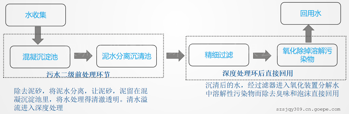但增加了分散污水处理独立的二级处理设施和回用设施的投入,所以上述集中回用是将污水进行二级处理后再进行的深度处理工艺就无法将污水直接处理后实现并满足回用水质要求。也就是说在分散回用中,直接用深度处理回用工艺处理是无法满足循环使用的水质标准